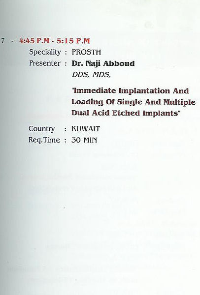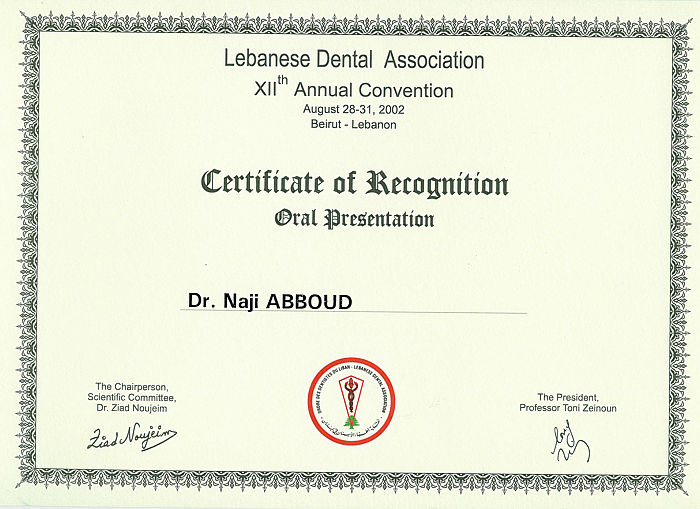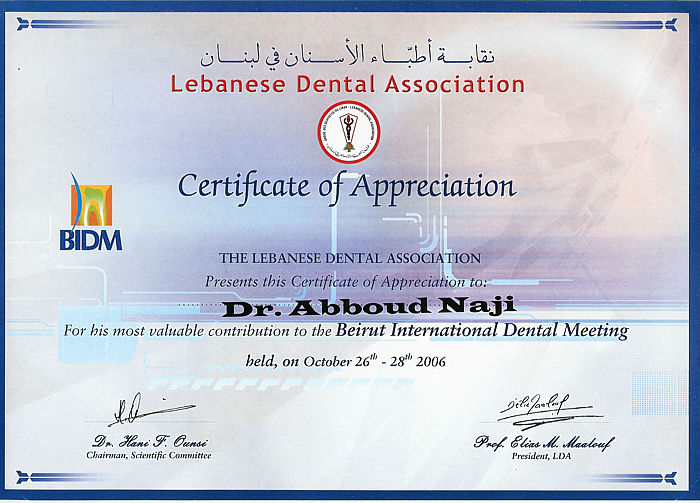 Dr Abboud is an international lecturer, he gives many presentations on these topics in international and local dental meetings, he is a surgical mentor for 3i (the biggest manufacturer of dental implants in the USA), he was a lecturer for the post graduate diploma in Periodontology and Implantology in Saint Joseph University (1996-2002) and is currently lecturing for the Oral Surgery post graduate program in the Lebanese University.